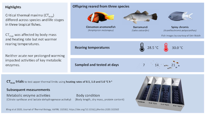Marine ectotherms are often sensitive to thermal stress, and certain life stages can be particularly vulnerable (e.g., larvae or spawners). In this study, we investigated the critical thermal maxima (CTmax) of larval and early juvenile life stages of three tropical marine fishes (Acanthochromis polyacanthus, Amphiprion melanopus, and Lates calcarifer). We tested for potential effects of developmental acclimation, life stage, and experimental heating rates, and we measured metabolic enzyme activities from aerobic (citrate synthase, CS) and anaerobic pathways (lactate dehydrogenase, LDH). A slightly elevated rearing temperature neither influenced CTmax nor CS activity, which otherwise could have indicated thermal acclimation. However, we found CTmax to either remain stable (Acanthrochromis polyacanthus) or increase with body mass during early ontogeny (Amphiprion melanopus and Lates calcarifer). In all three species, faster heating rates lead to higher CTmax. Acute temperature stress did not change CS or LDH activities, suggesting that overall aerobic and anaerobic metabolism remained stable. Lates calcarifer, a catadromous species that migrates from oceanic to riverine habitats upon metamorphosis, had higher CTmax than the two coral reef fish species. We highlight that, for obtaining conservative estimates of a fish species’ upper thermal limits, several developmental stages and body mass ranges should be examined. Moreover, upper thermal limits should be assessed using standardized heating rates. This will not only benefit comparative approaches but also aid in assessing geographic (re-) distributions and climate change sensitivity of marine fishes.